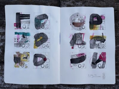Zwölf Bilder an einem 12. des Monats – so lautet schon seit Jahren die Regel der Blogreihe 12 von 12. Die Beiträge sammelt (auch schon seit Jahren) Caro bei Draussen nur Kännchen. Weil ich es nicht geschafft habe, zwölf Fotos zu machen, habe ich in meinem Artjournal kleine Zeichnungen gefertig. Ich habe mit ein Raster
